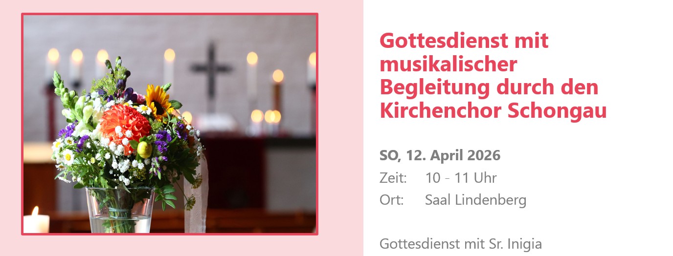 Am SO, 12. April findet im Saal Lindenberg ein katholischer Gottesdienst mit musikalischer Begleitung des Kirchenchors Schongau statt.