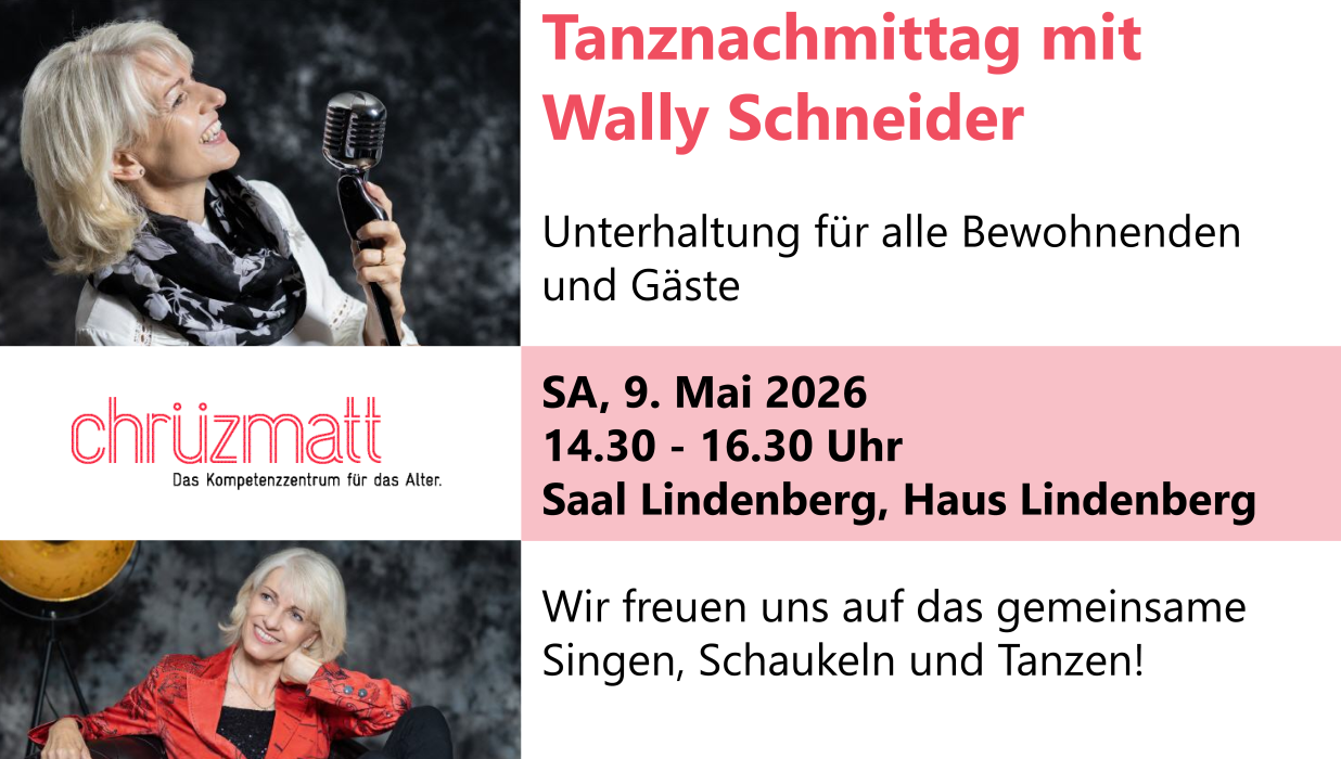 Wir freuen uns sehr, dass Wally Schneider wieder in der Chrüzmatt ist. Besuchen Sie uns an diesem Tanznachmittag die Chrüzmatt und schwingen Sie gemeinsam mit unseren Bewohnenden das Tanzbein.